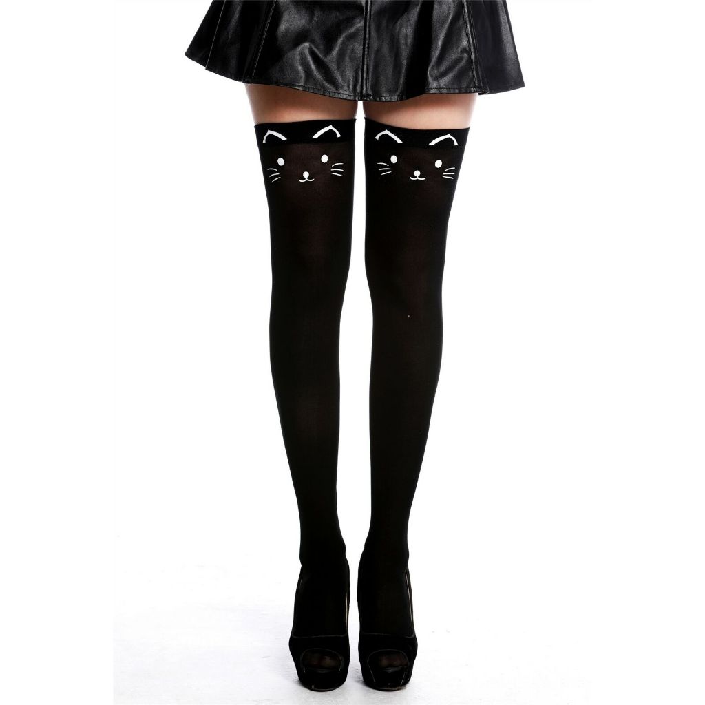 Meia 7/8 Longa Com desenho de Gatinho Cor Preta - Cosplay Gótica Geek