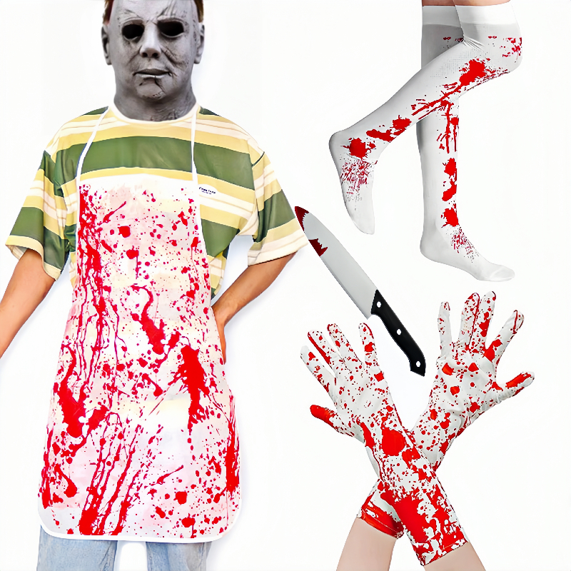 Kit de faca com avental, luvas e meia-calça 7/8 com estampa de sangue fantasia festa de Halloween cosplay
