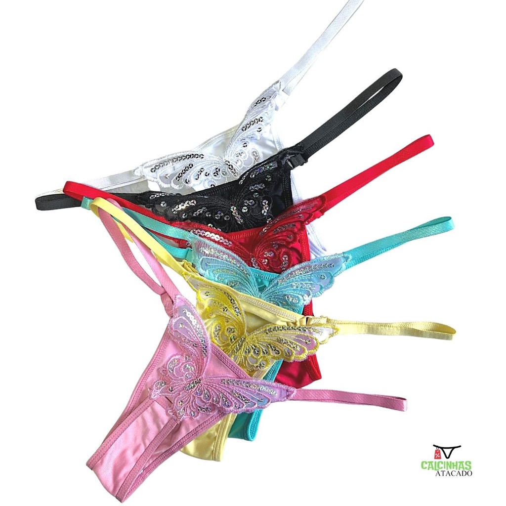 Kit 3 Calcinhas Borboleta Fio Dental Sexy com Regulagem Sensual Paetê Lingerie Feminina Tanga
