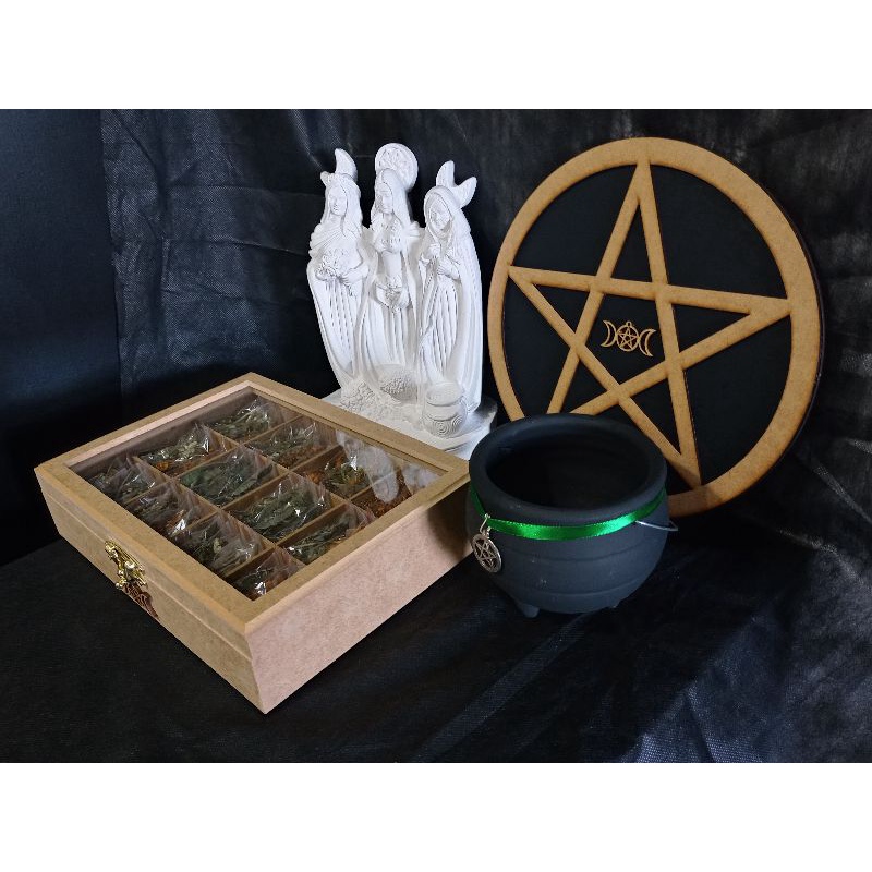 Wicca Caixa de Ervas da Bruxa + Altar Pentacúlo + Caldeirão da Bruxa + Deusas Tríplice ou Lua