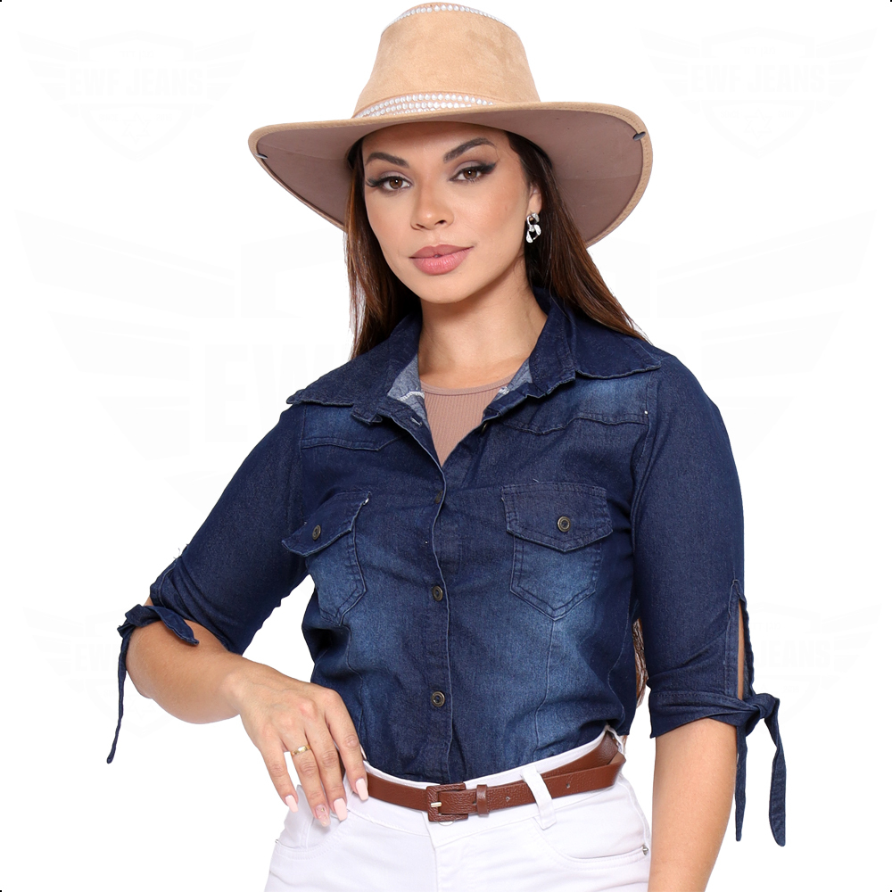 Camisa Jeans Social Feminina Manga 3/4 Moda Country Sertanejo Rodeio Cowgirl Boiadeira - EWF - Azul Escuro