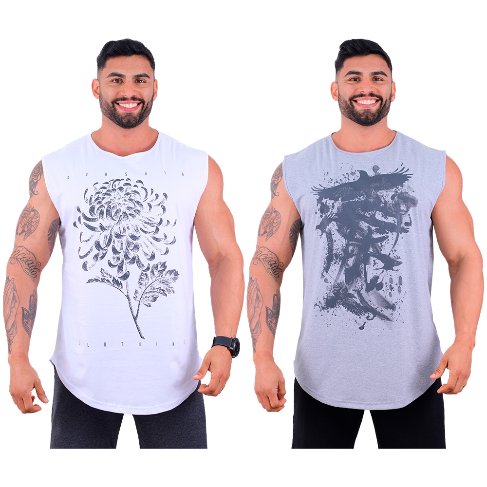 Kit 2 Unidades Regata Machão Longline MXD Conceito Com Estampas Academia Treino