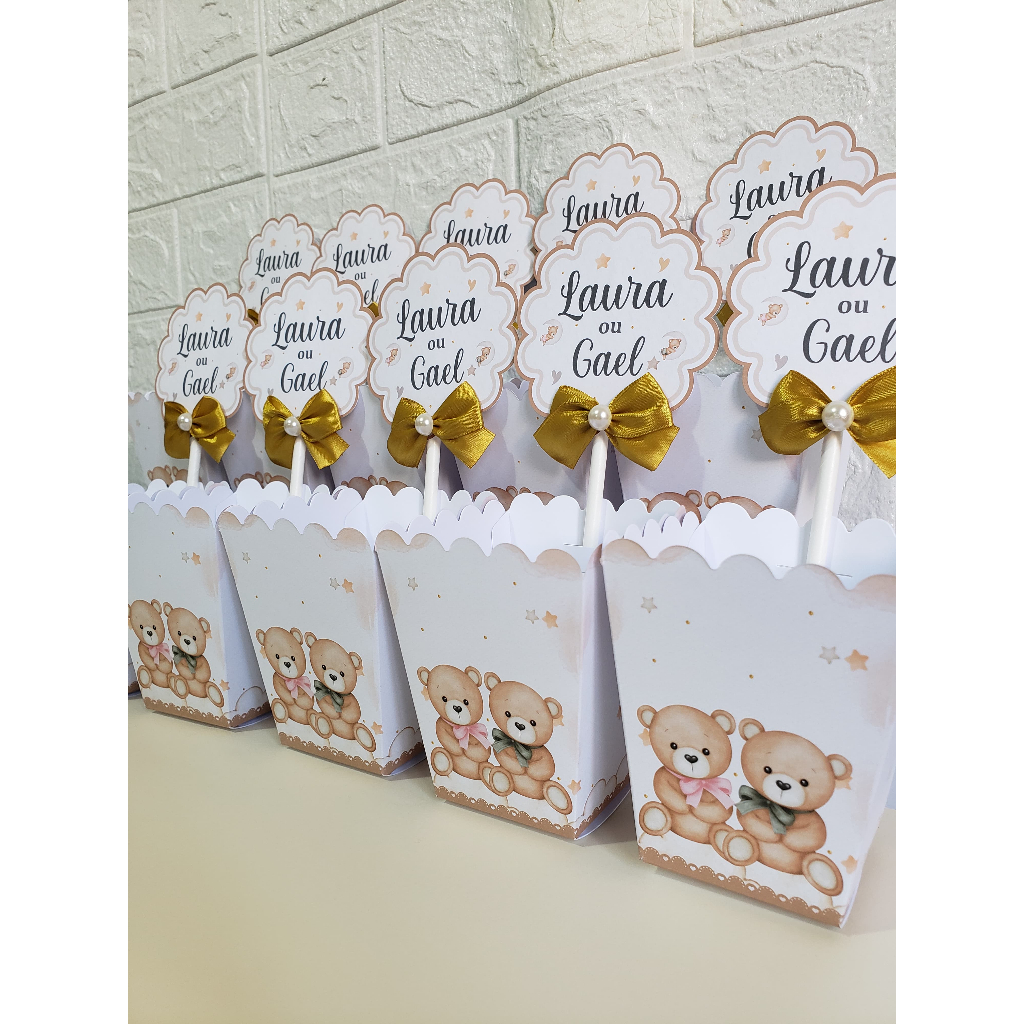 PEGUE E MONTE - Kit Festa Personalizado Chá Revelação Ursinhos Branco Lembrancinhas Caixinhas para festa