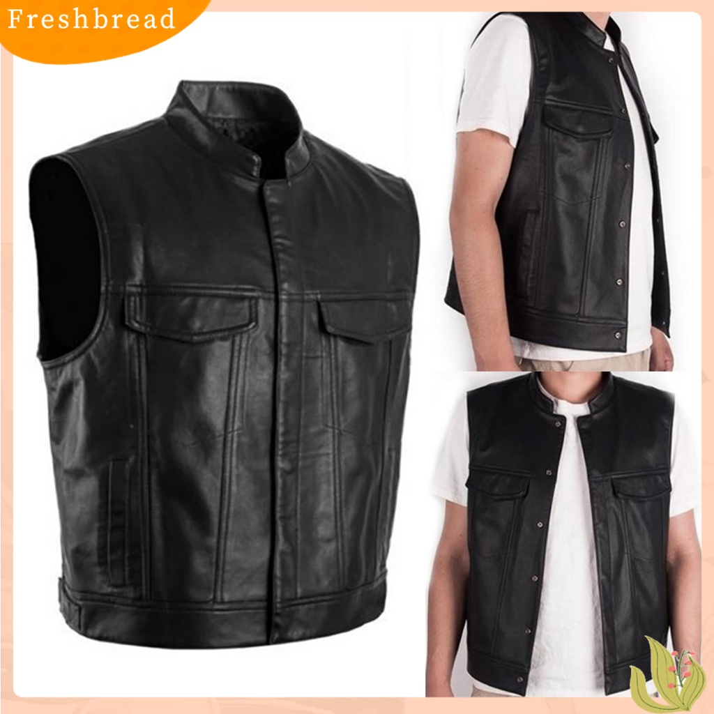 { FR } Colarinho De Pé Homem Sem Mangas Colete De Cintura Botões De Couro Fecho Bolsos De Fechamento Motocicleta Roupas Masculinas