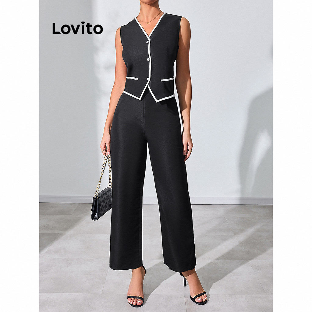 Lovito Conjuntos elegantes de calças assimétricas frontais com botão de contraste liso para mulheres LBL15086