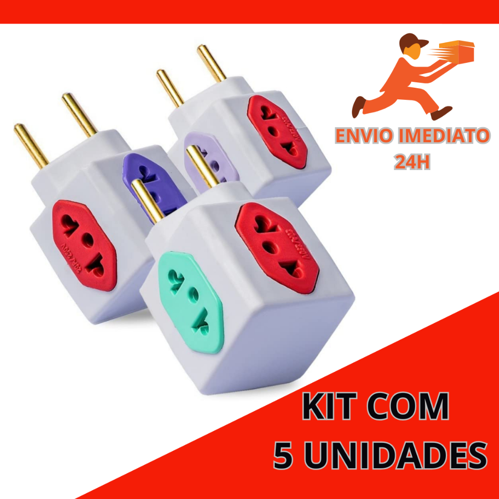 Adaptador de Tomada Kit C/5 Benjamin 10A/20A CUBO Pino Maciço Resistente 4 Tomadas Coloridas