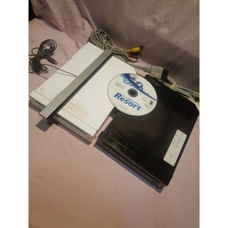 Dois Nintendo Wii. Barra de sensor Original, jogo e cabos AV. O preto liga e lê jogos. O branco acende o led e não liga. Não sei se é desbloq.ueado