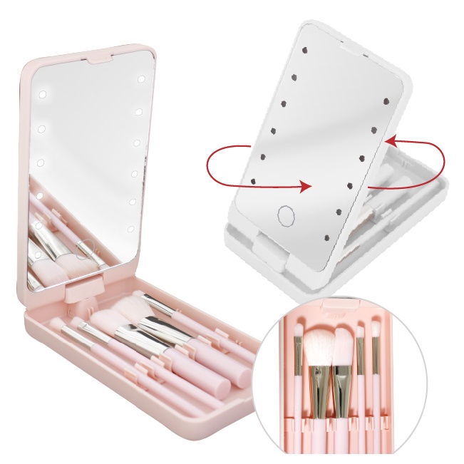Espelho de Mesa 12 Leds Estojo com 5 Pincéis Maquiagem Portátil