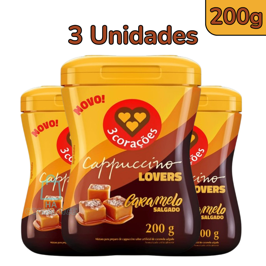 Kit 3 Unidades Cappuccino Lovers Sabor Caramelo Salgado 200g Café Solúvel 3 Corações Pote Promoção