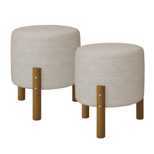Kit 2 Puff Banqueta Banquinho Redondo Em Linho Bege Thor Luxo Pés de Madeira