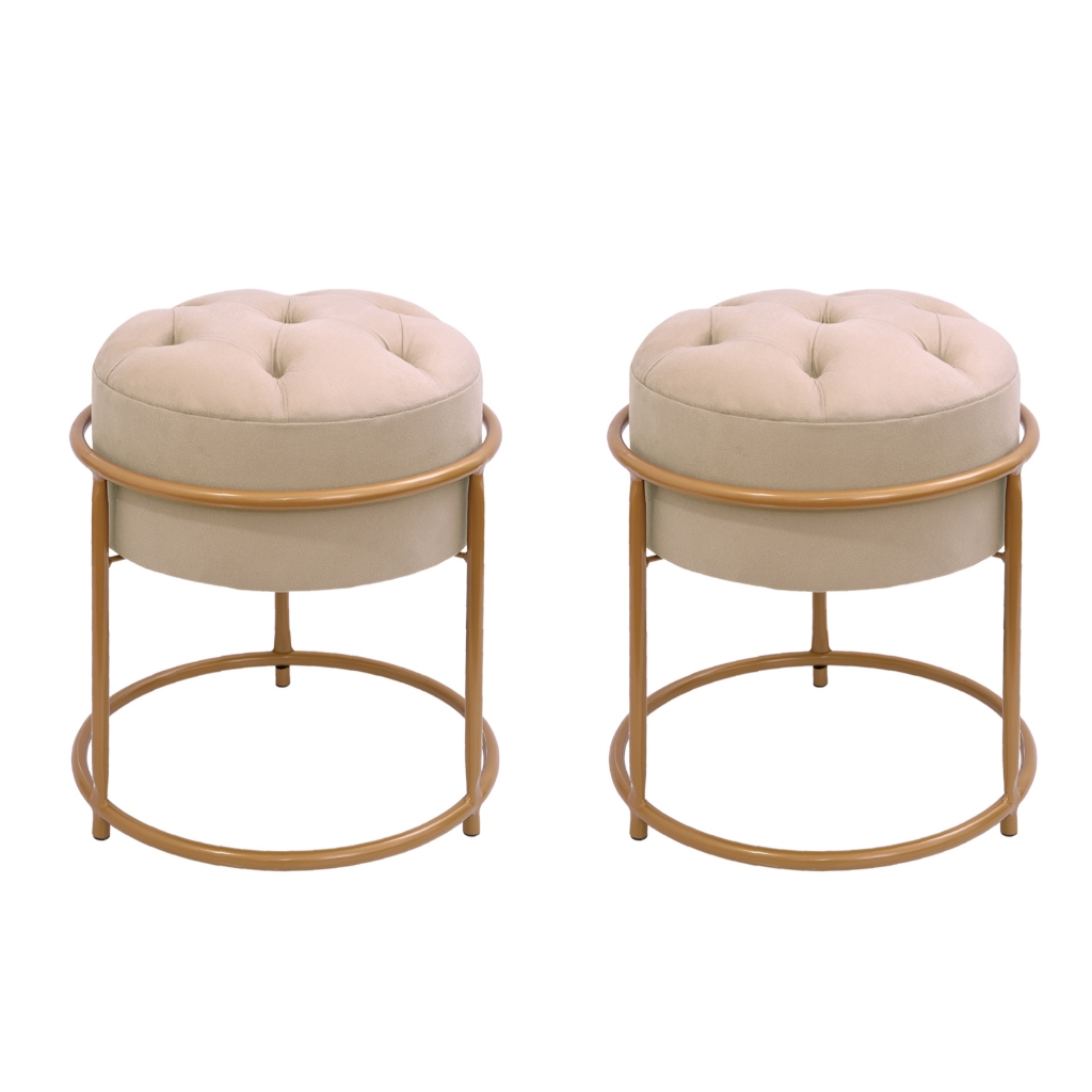 2 Puffs Redondo Capitonê, Botão, Base Dourado, Banqueta, Sentar, Casa, Sala
