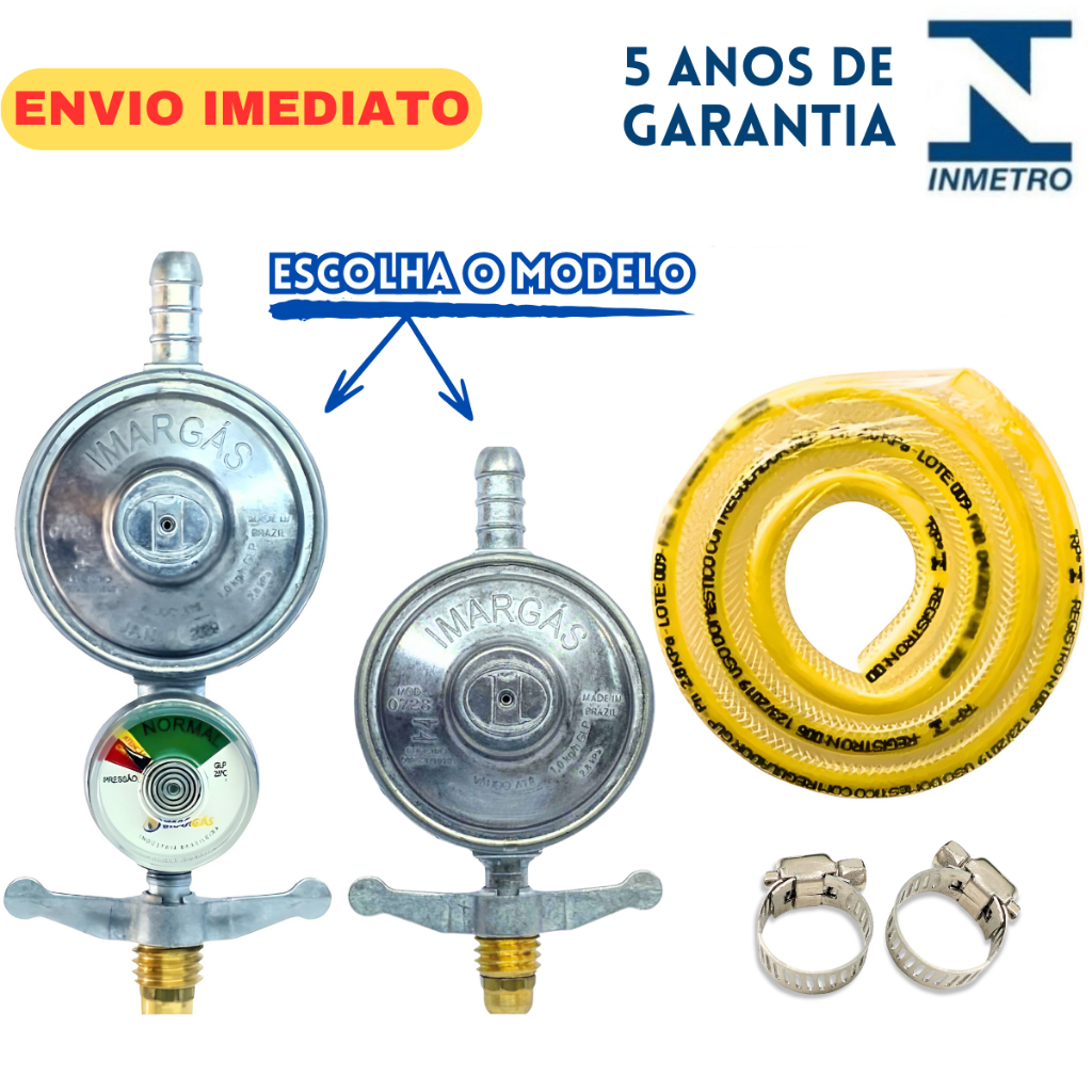 Regulador Gas Registro com Marcador Visor Manometro 1KG/H para Botijão de cozinha 13Kg Com Mangueira e Abraçadeiras kit completo