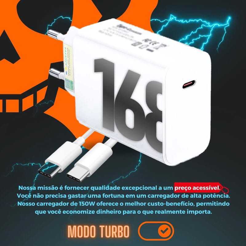 Carregador 168W com Cabo Tipo C 6A Carga Rápida Power