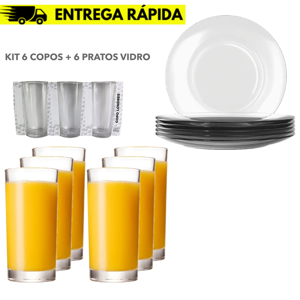 Jogo Pratos Fundo e 6 Copos Vidro Londres Aparelho de Jantar Kit 12 Peças