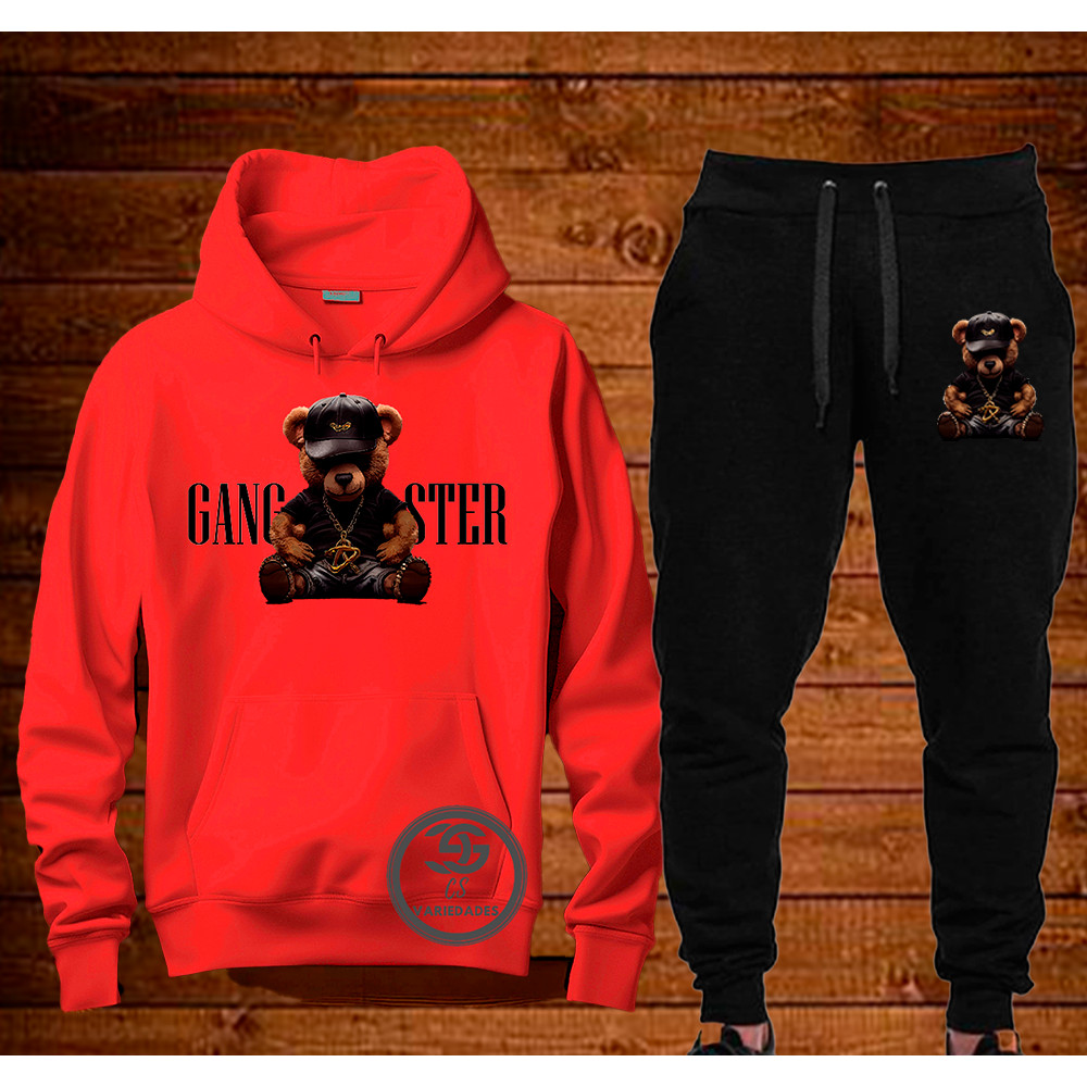 Conjunto Moletom Gangster Urso Streetwear Blusa + calça de moletom Casaco Com Capuz Flanelado Agasalho de Frio Unissex