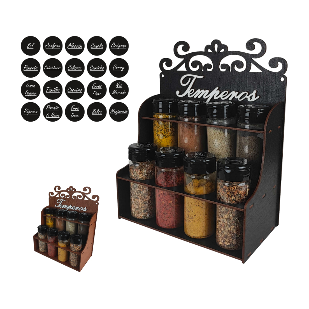 Porta Temperos Arabesco 8 Potes com Etiquetas Para Mesa e Bancada de Cozinha